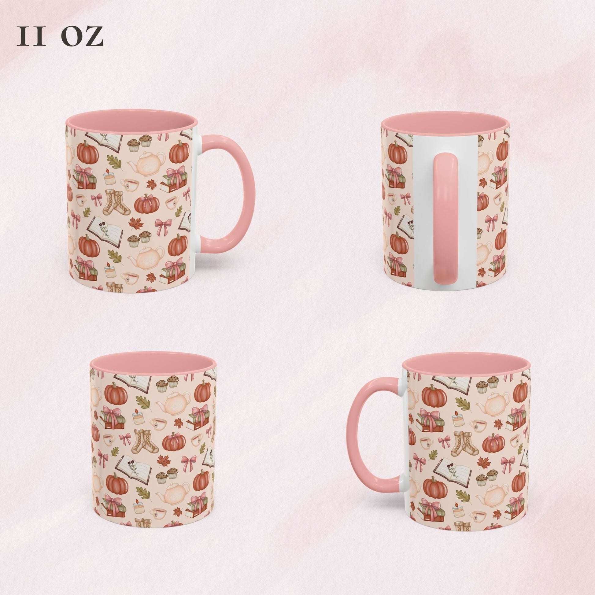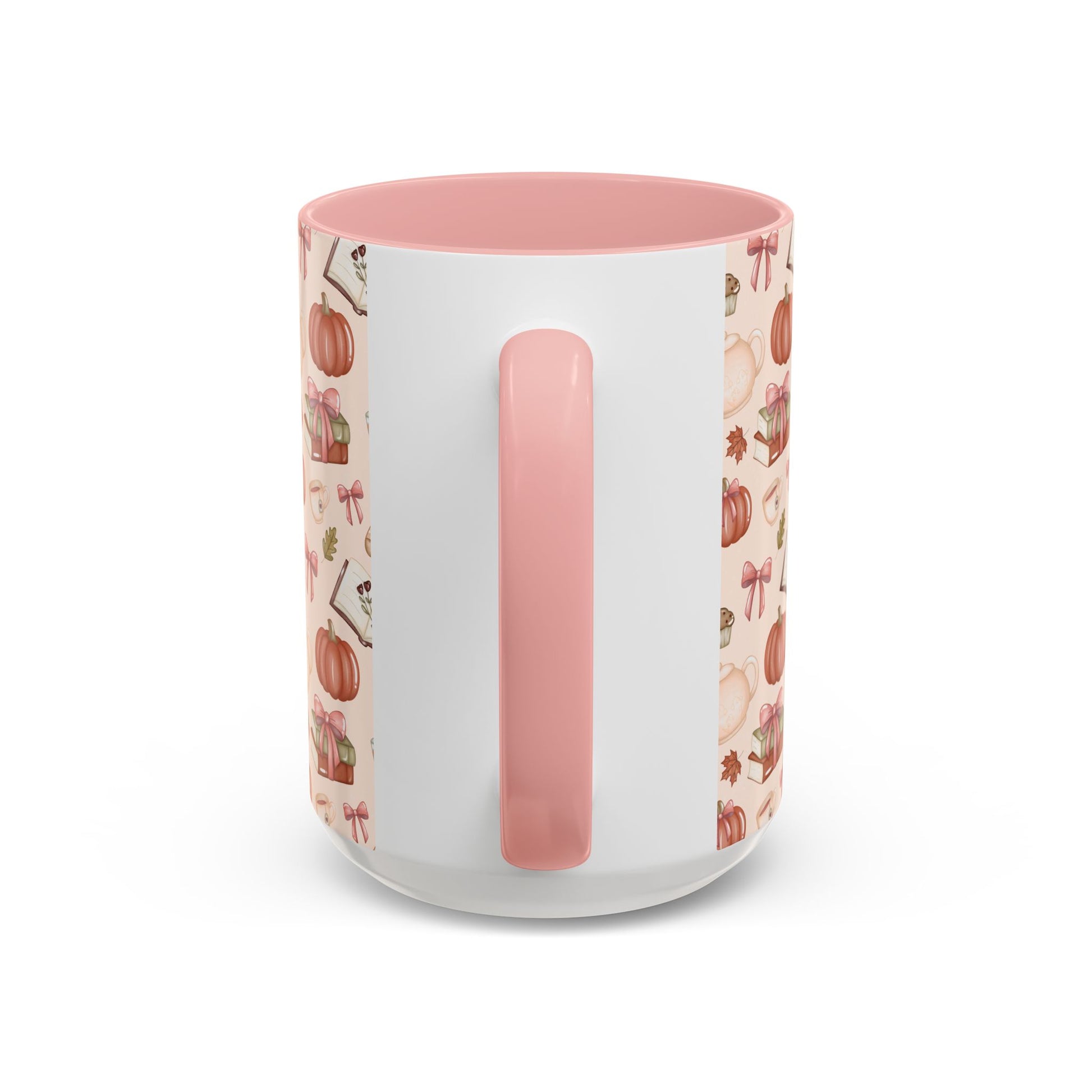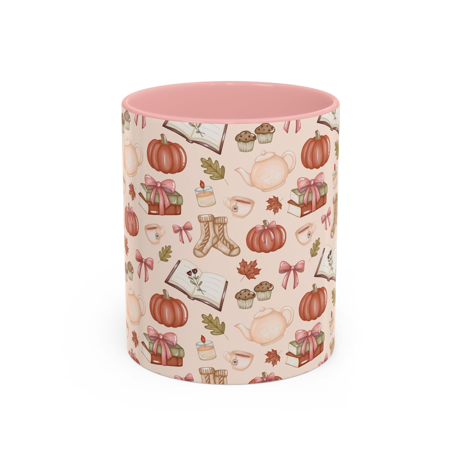 This sweet ceramic mug is wrapped in a whimsical fall pattern featuring pumpkins, books tied with bows, tea cups, muffins, candles, and leafy details — all in warm, soft watercolor hues. With its pink handle and rim, it’s the perfect blend of cottage-core charm and seasonal warmth. 🍁