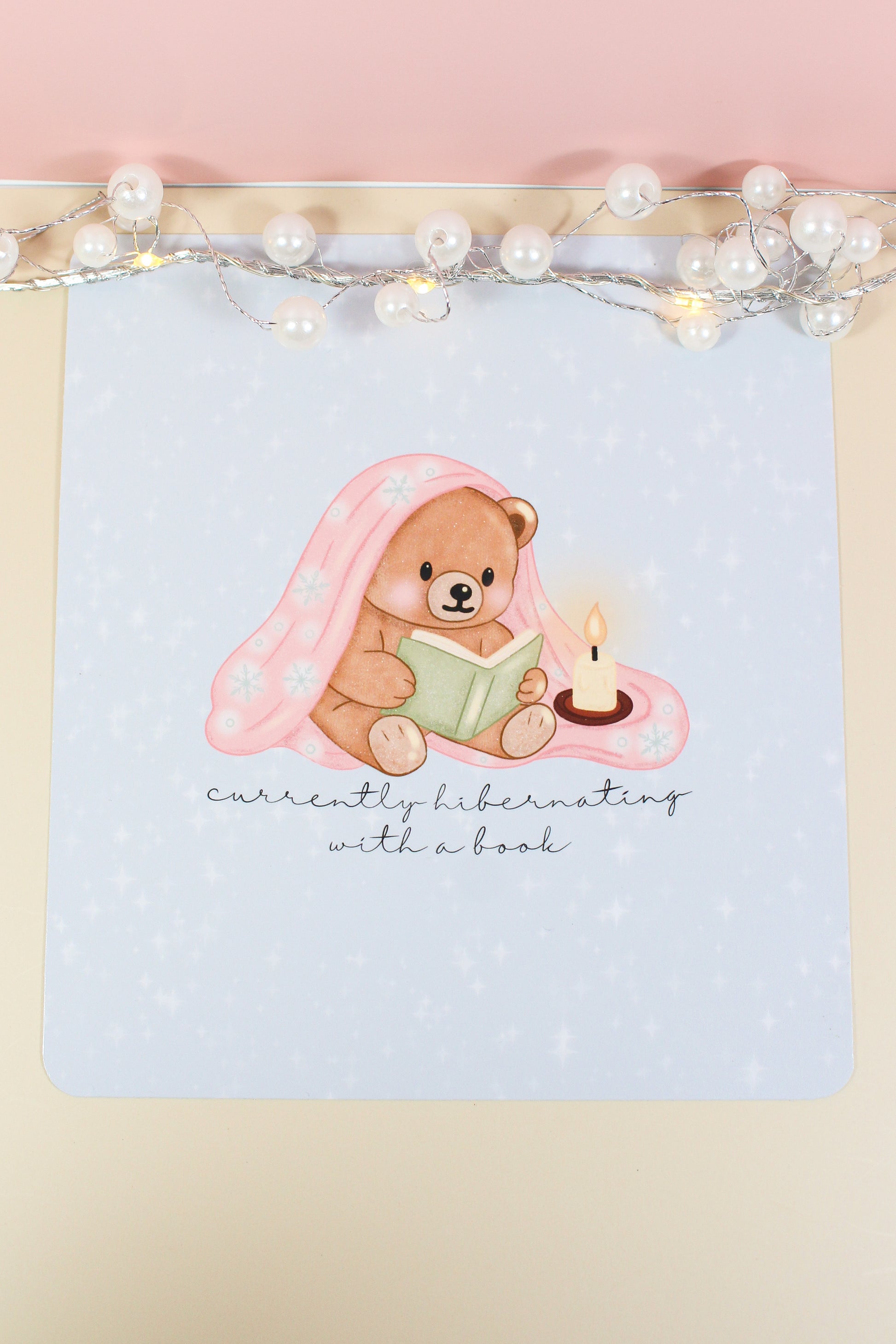 Hibernate in style. This reusable e-reader insert features a snuggly bear under a pink snowflake blanket, candlelight glow, and the phrase “currently hibernating with a book.” Set on a soft winter-sky backdrop, it slips beneath a clear case for instant bookish coziness.