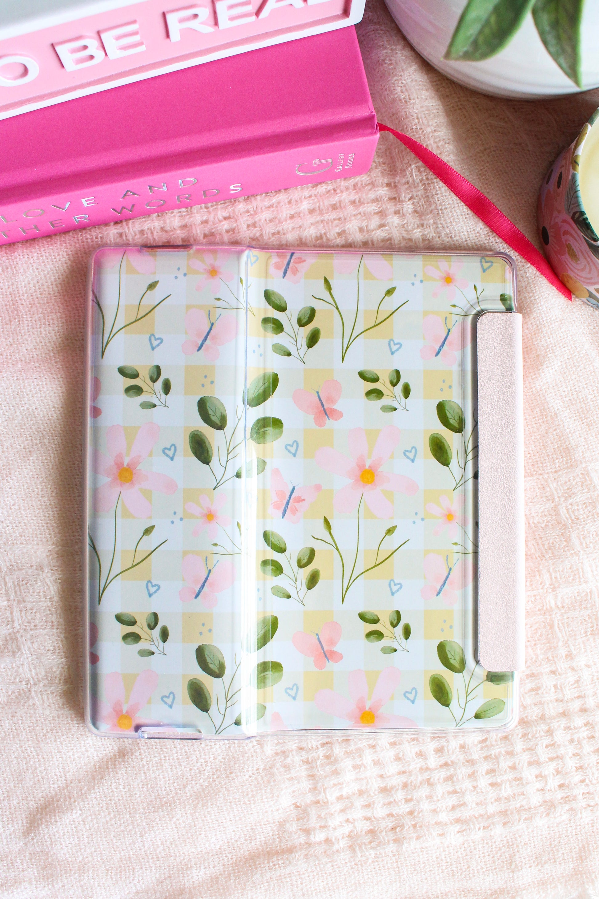 Meet your new sunshine pattern. This reusable e-reader insert layers soft yellow gingham with hand-painted blossoms, butterflies, and leafy sprigs—fresh, light, and happy. Slide it under a clear case for instant everyday whimsy.