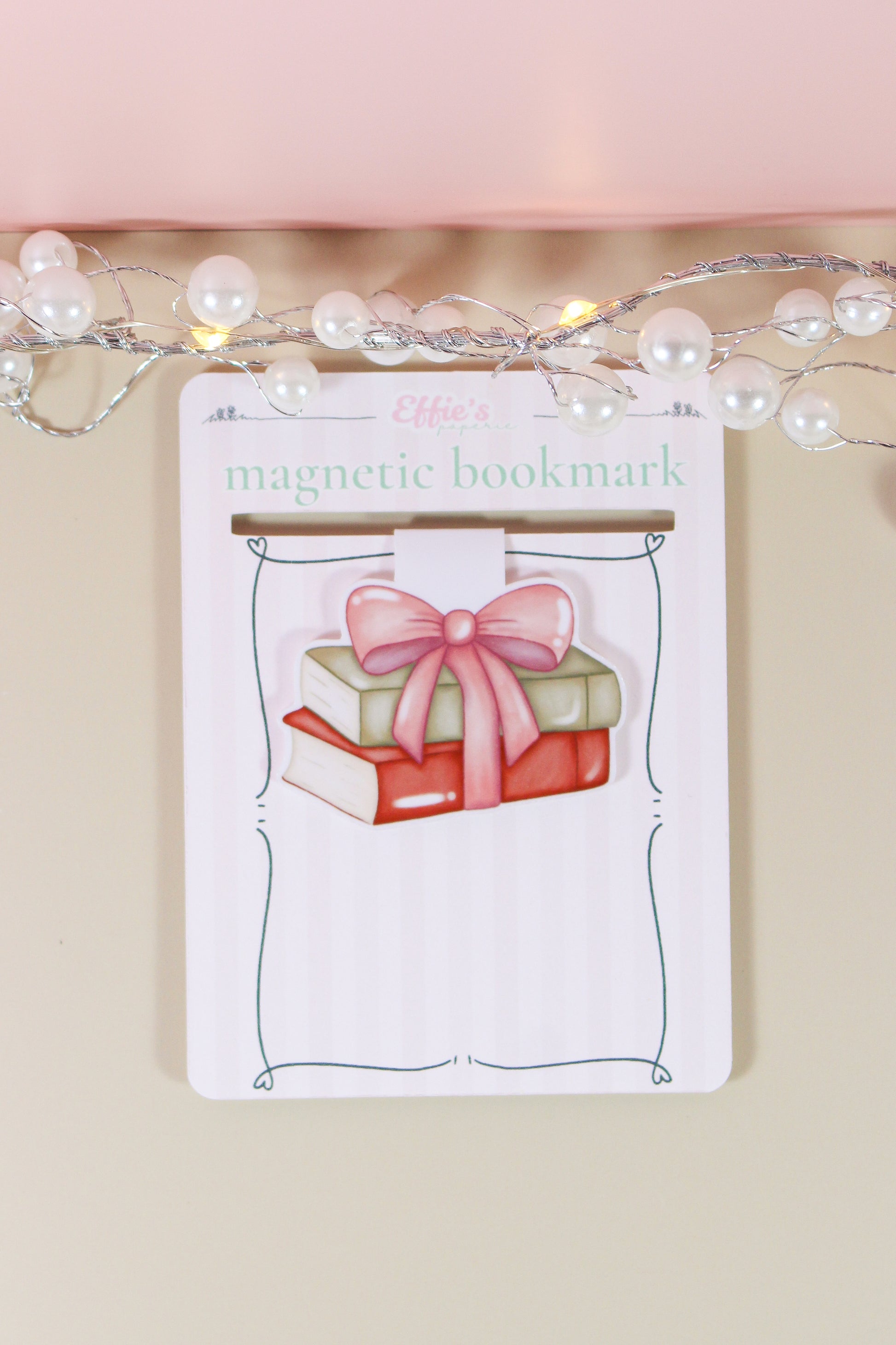Classic books meet soft coquette charm in this pink bow book stack magnetic bookmark. Featuring stacked books tied with a rosy ribbon, this design is perfect for readers who love feminine, cozy, and whimsical stationery.