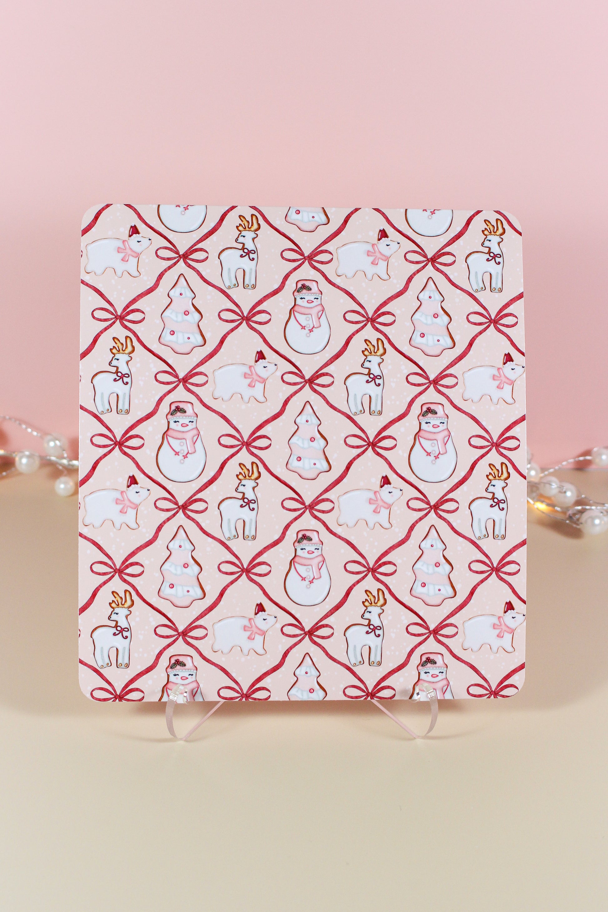 Bring cozy bakery vibes to your reading time. This reusable e-reader insert features hand-drawn sugar-cookie reindeer, snowmen, and trees tied in a bow lattice on soft blush—sweet, festive, and perfectly cottage-core. Slip it beneath a clear case for instant holiday charm.