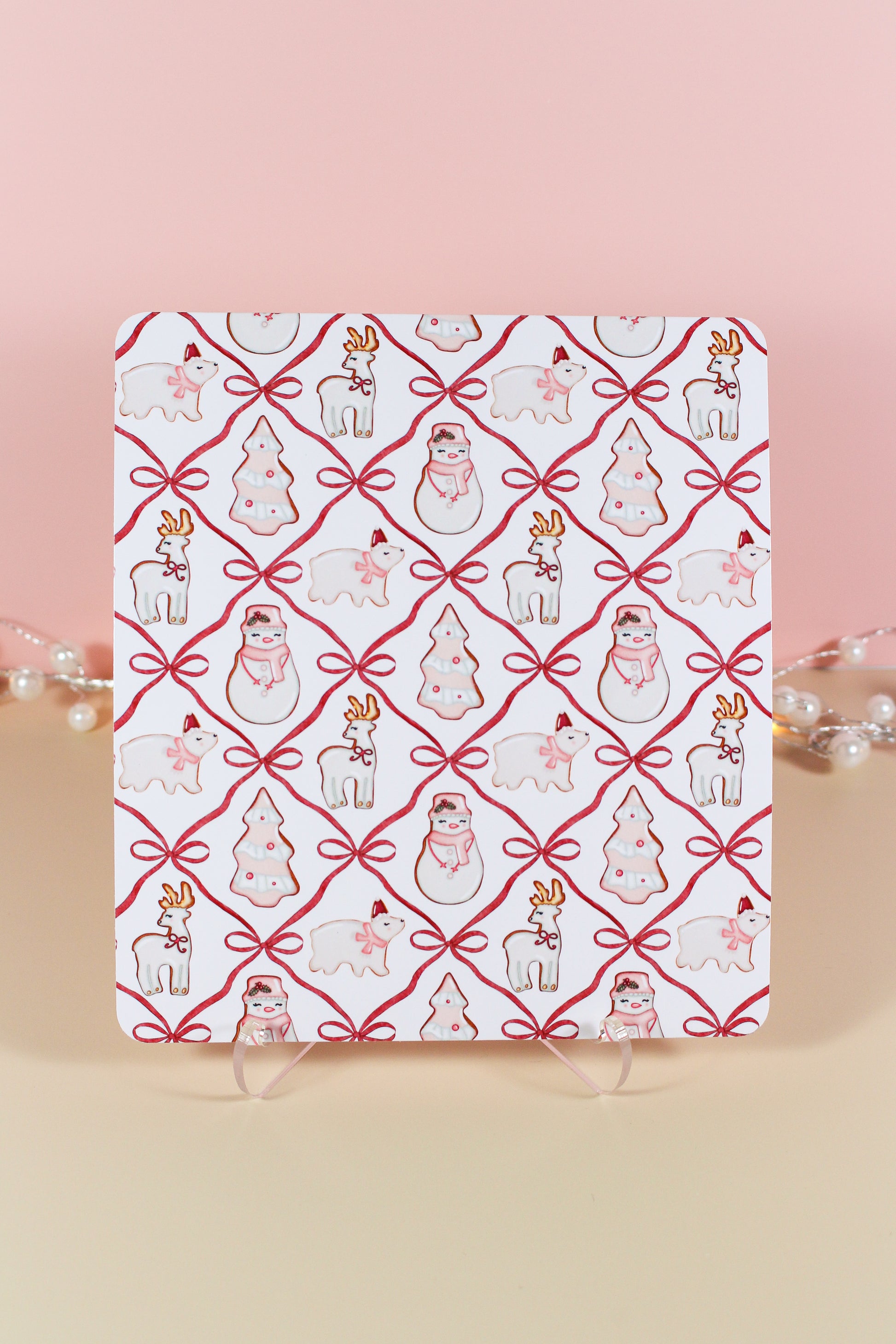 Crisp and merry. This e-reader insert pairs white bakery-style icing cookies—reindeer, snowmen, polar bears, and trees—with a red bow lattice for classic holiday sparkle. Slide under a clear case for instant Christmas magic.