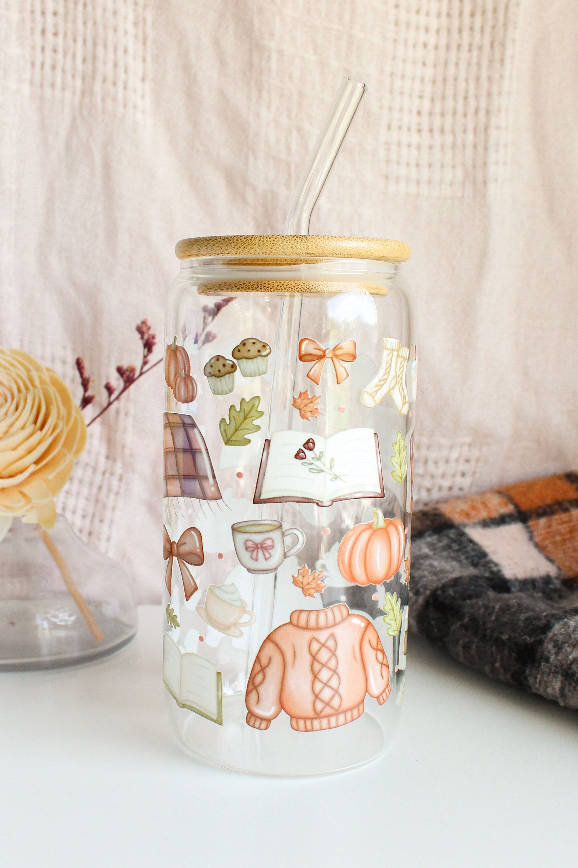 Sip into fall with our Sweater Weather 16oz glass cup—sprinkled with watercolor-soft icons: cable-knit sweater, bows, pumpkins, muffins, books, coffee mugs, blanket, and leaves. Finished with a bamboo lid and reusable glass straw, it’s cottage-core comfort for coffee, tea, matcha, and iced lattes.