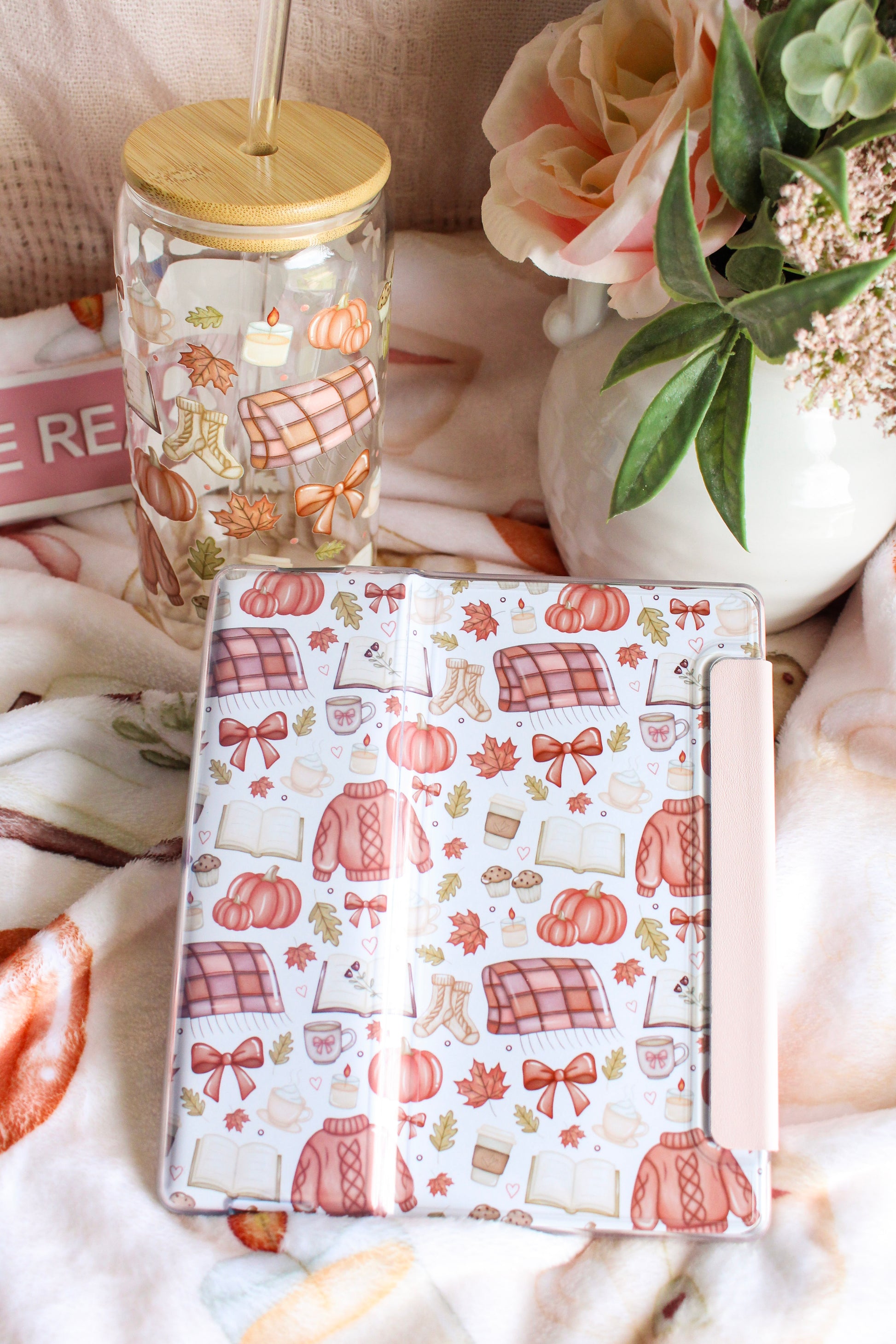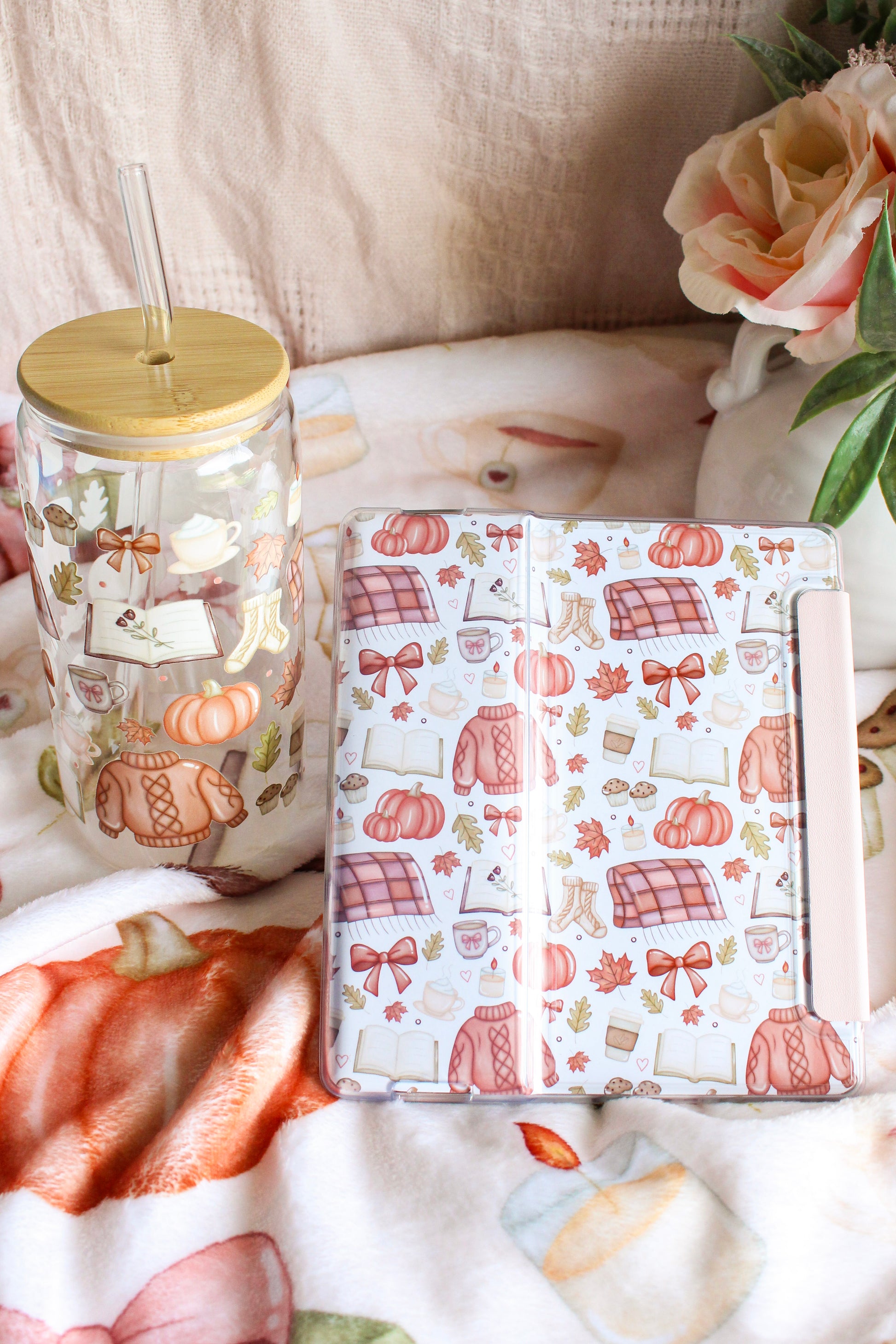 Bring sweater-weather to story time. This reusable e-reader insert is sprinkled with hand-drawn cable-knit sweaters, plaid blankets, pumpkins, bows, books, and steaming mugs—your cottage-core backdrop for the back of your device. Slip it beneath a clear case for instant autumn magic.
