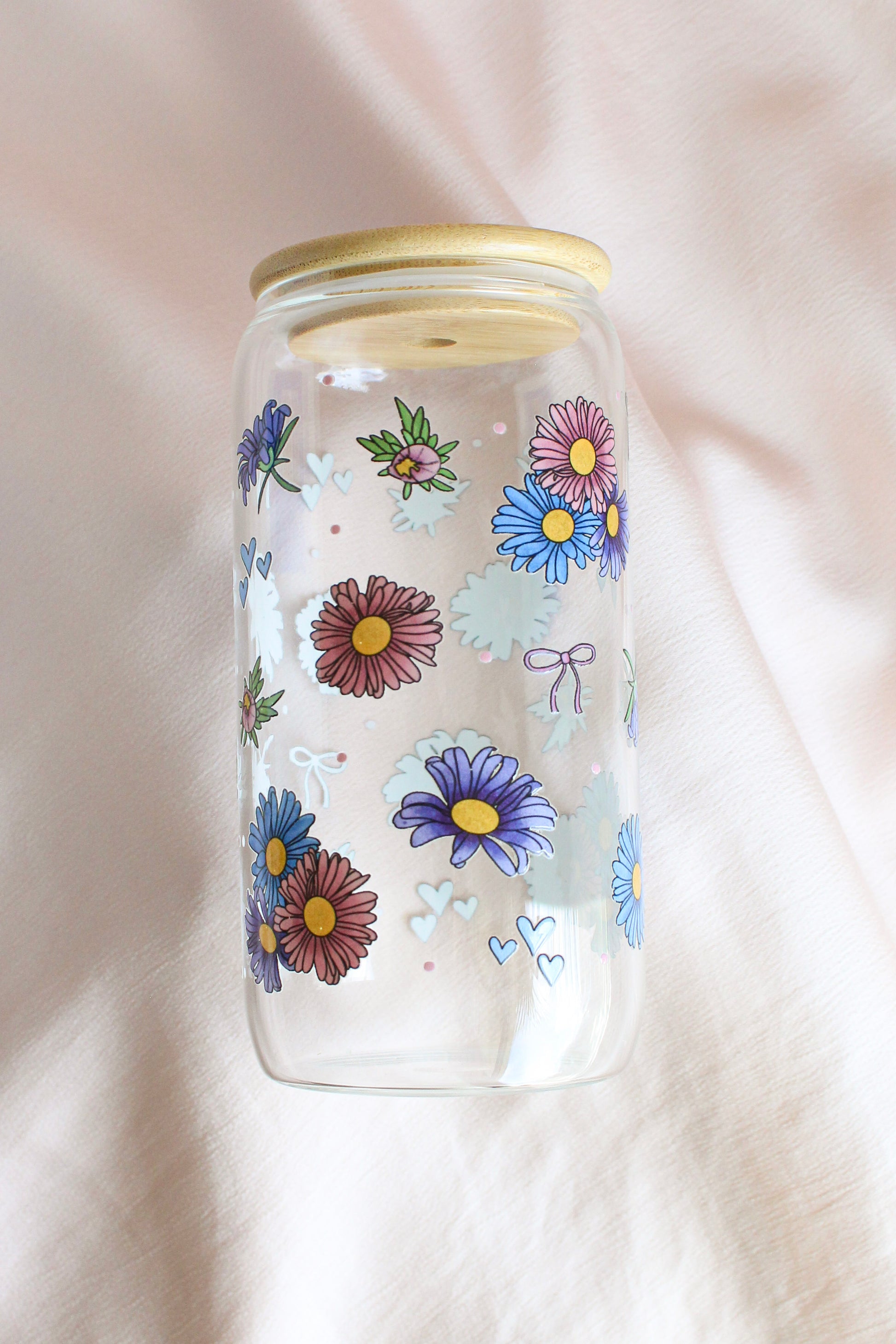 Bring a little meadow to your morning. This 16oz glass cup is sprinkled with hand-drawn daisies, tiny hearts, and delicate bows in bright pastel tones—finished with a bamboo lid and reusable glass straw for everyday magic.
